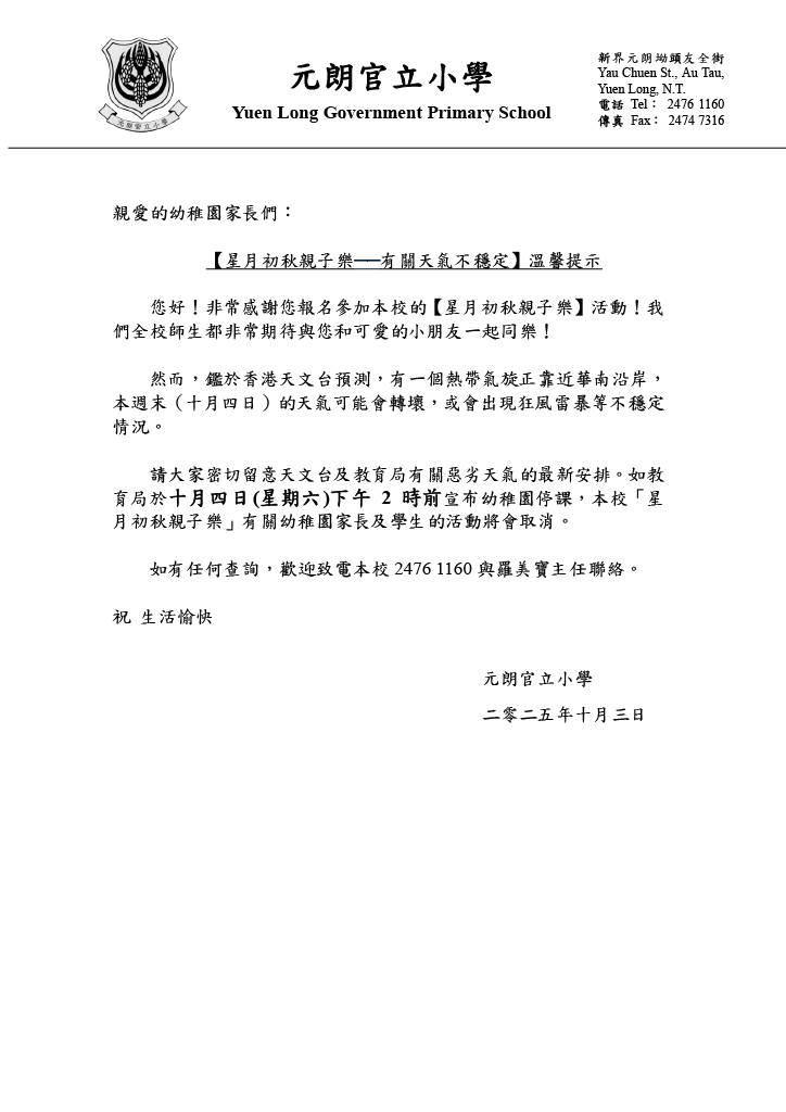 【星月初秋親子樂 ── 有關天氣不穩定】溫馨提示