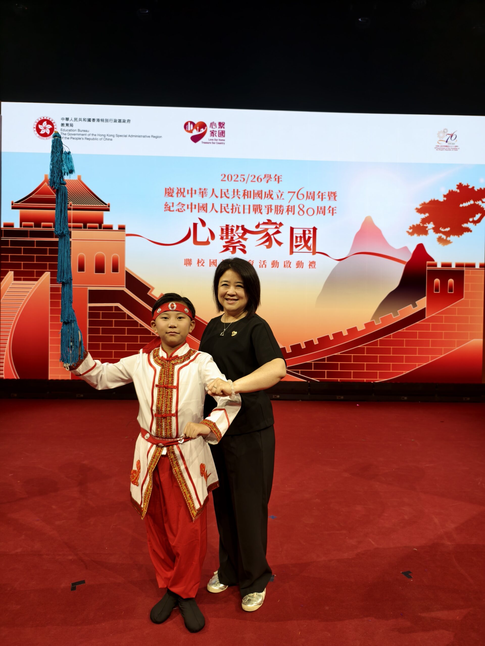 活動名稱:心繫家國3.0活動日期:15/10/2025活動地點:伊利沙伯體育館活動簡介:本校陳溢康同學有幸參與「慶祝中華人民共和國成立七十六周年暨聯校國民教育活動啟動禮」的粵劇表演。陳溢康同學小小年紀,不怕艱辛,刻苦練習,最終能站在台上成功演出,並獲得觀眾的熱烈讚賞。