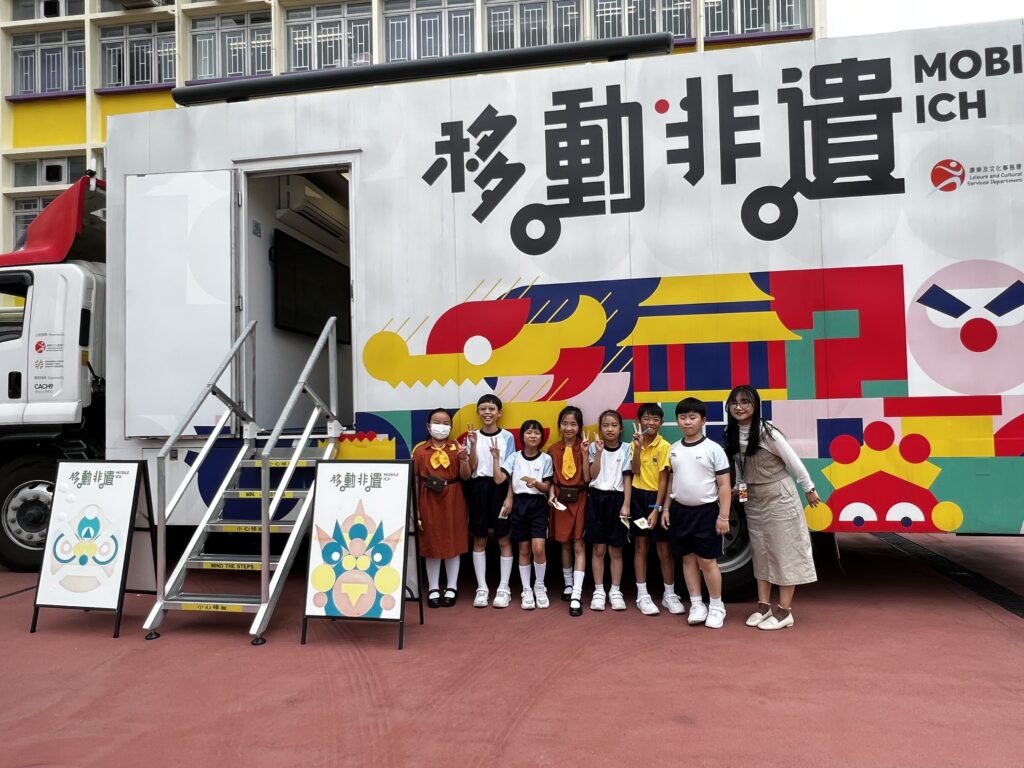 活動名稱:非遺專車計劃-「移動.非遺」學校教育活動 活動日期:8-10/11/2023 活動簡介:為了增加學生對香港非物質文化遺產(非遺)的認識和興趣,本校安排了「移動.非遺」專車駛進校園,把不同的「非遺」項目帶到各師生眼前。非遺專車內設有展覽及互動設施,同時配有一系列教育活動,例如「非遺專車小館長